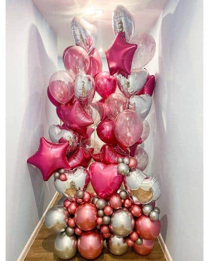 Сочетание разных форм, текстур и цветов может создать удивительную атмосферу в любом помещении. Розовые, фиолетовые и белые шары, украшенные лентами и бантиками, добавят красоты и нежности, а золотые, серебряные и бирюзовые шары с пайетками, создадут праздничный блеск.