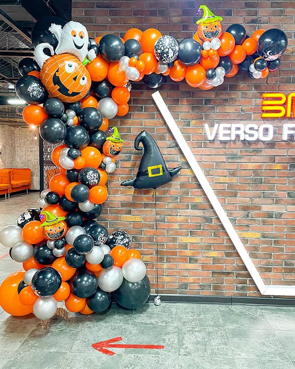Тематическая фотозона, выполненная в стиле Хэллоуина. Сочетает в себе разнокалиберную гирлянду, а так же несколько фигур с гелием.